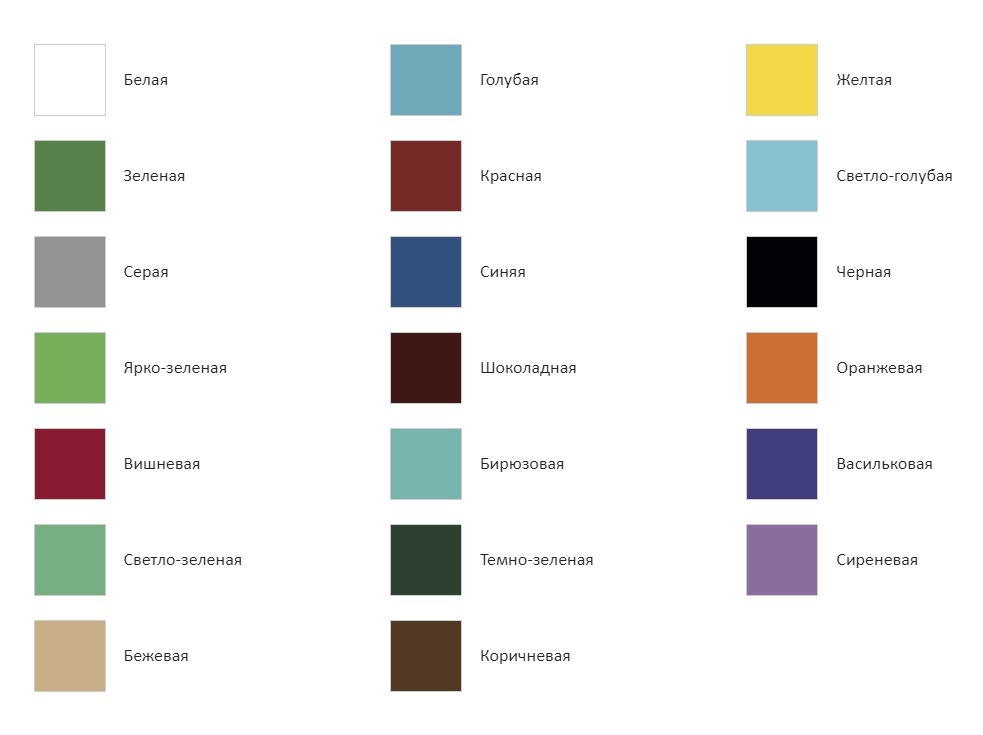 Цветовая гамма: белая, васильковая, голубая, желтая, зеленая, красная, светло-зеленая, серая, черная, шоколадная.