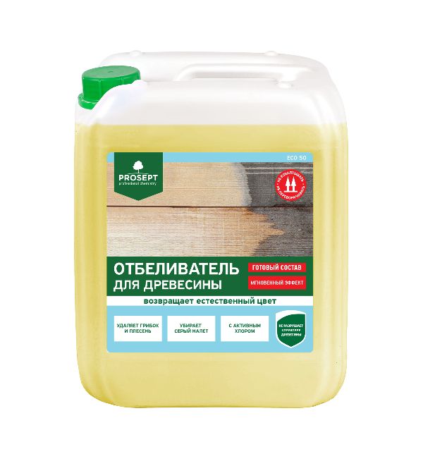 Механизм действия: PROSEPT ECO 50 – это высокоэффективная композиция действующих веществ на основе хлорсодержащих соединений. Активные ионы хлора хорошо проникают в поверхность древесины и эффективно обесцвечивают деревоокрашивающие грибы (синеву) и серый налет на глубине до 3 мм, не разрушая поверхность древесины.