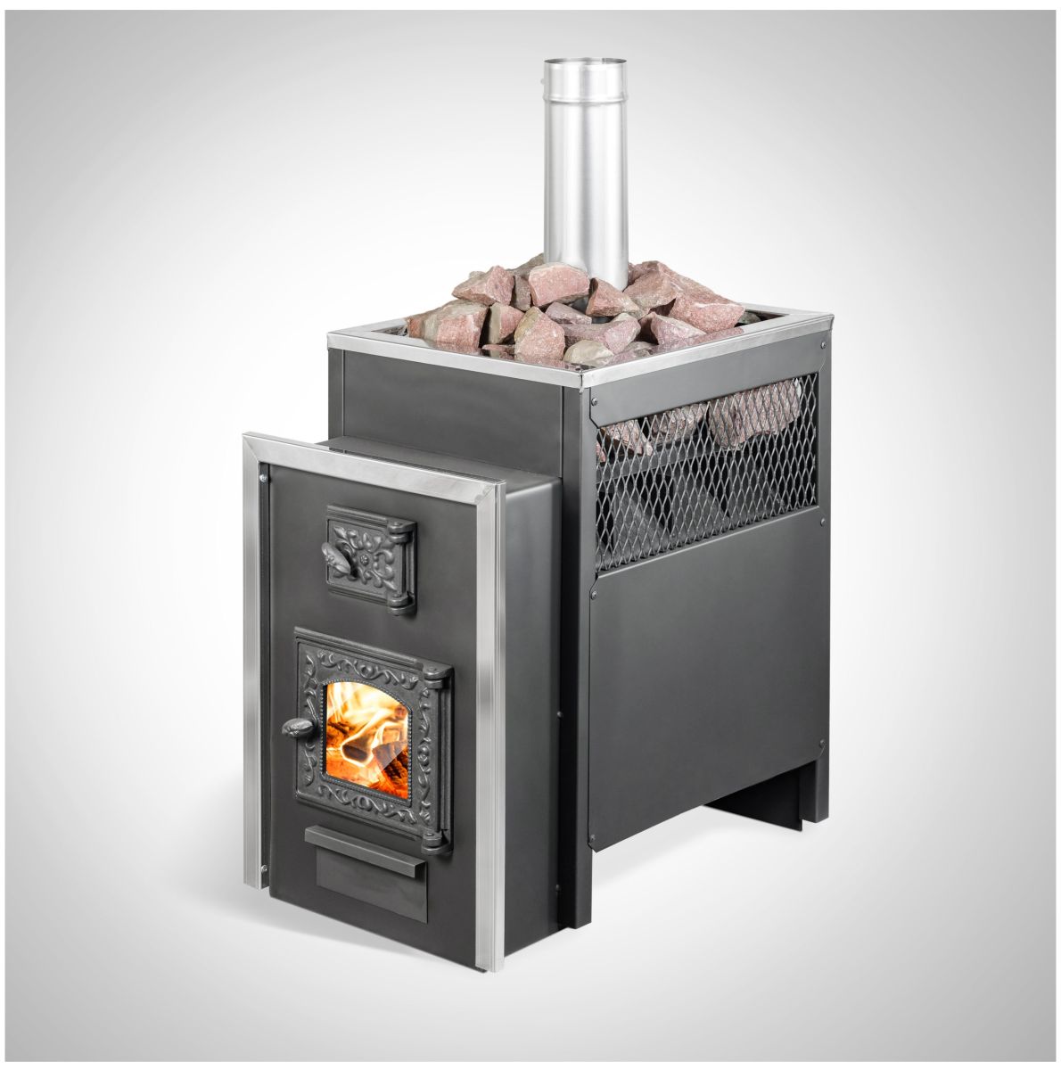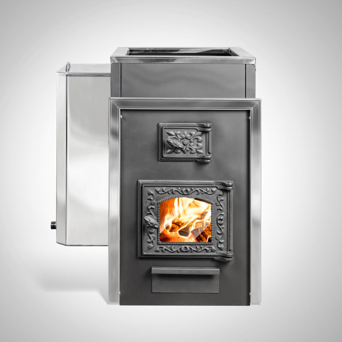 Печь предназначена для бань и парных средних размеров. Высокую динамику нагрева парильного помещения обеспечивает конструкция дымохода. Вместительная вентилируемая каменка открытого типа является мощным парогенератором. Конвекционный кожух печи способствует циркуляции воздуха, экранирует жесткое инфракрасное излучение от раскаленных стенок топки. Кожух съемный. После демонтажа стенки кожуха (справа, слева, сзади) можно удобно и надежно навесить бак объемом 45 литров. Рекомендуем устанавливать бак на заднюю стенку печи, чтобы обеспечить наиболее быстрый нагрев воды.