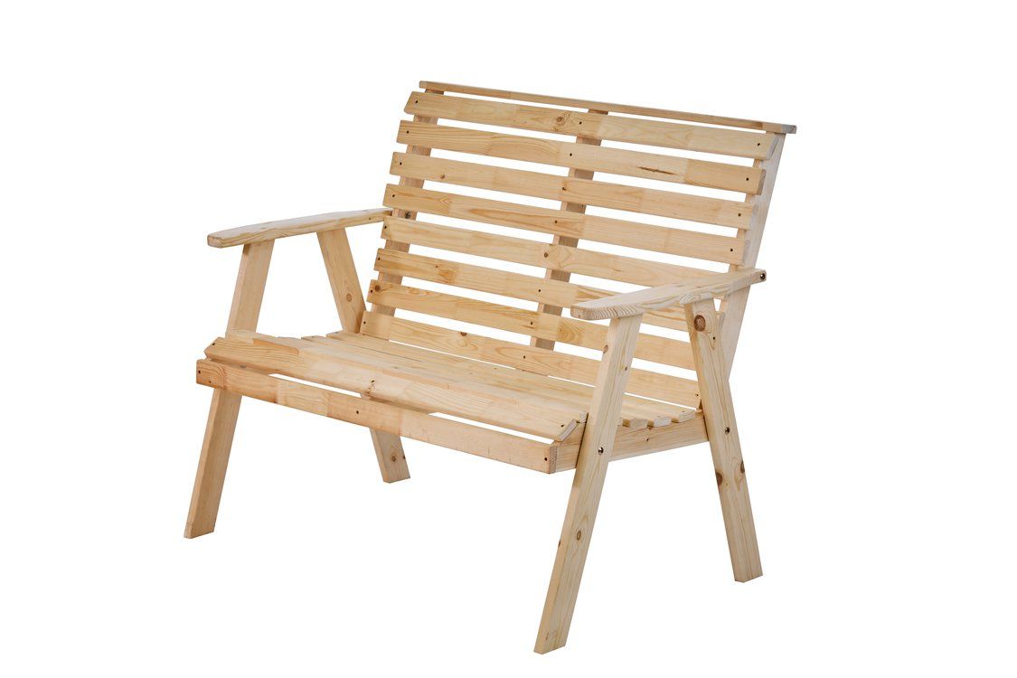 Неокрашенная садовая скамья для двоих человек с горизонтальной обрешеткой спинки и анатомическом изгибом сиденья. Наклон сиденья 17°, спинки 10°. Подойдет для обеденной группы или релакса на природе. Станет украшением уютного уголка сада или помещения.